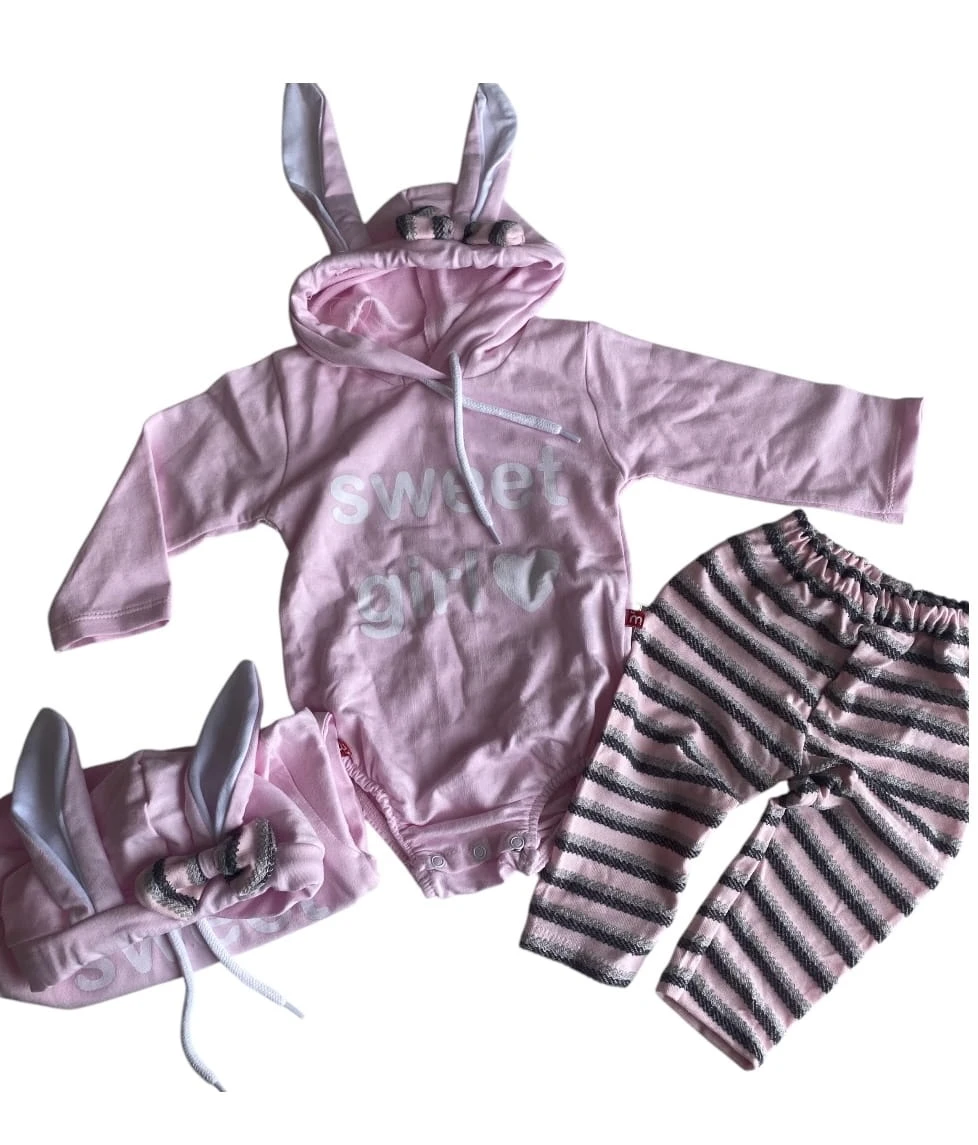 Komplet składa się z body na długi rękaw z doszytymi uszami na kapturze oraz spodni.