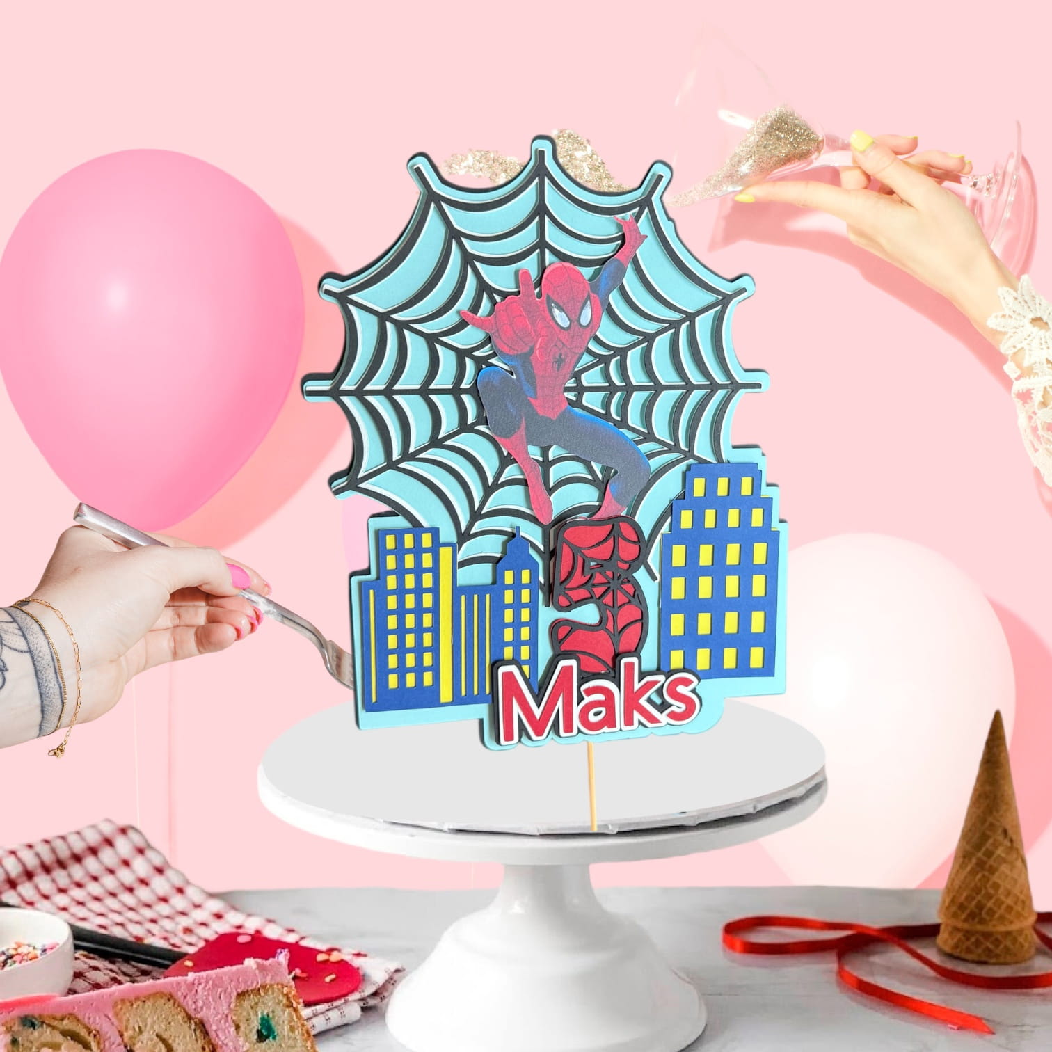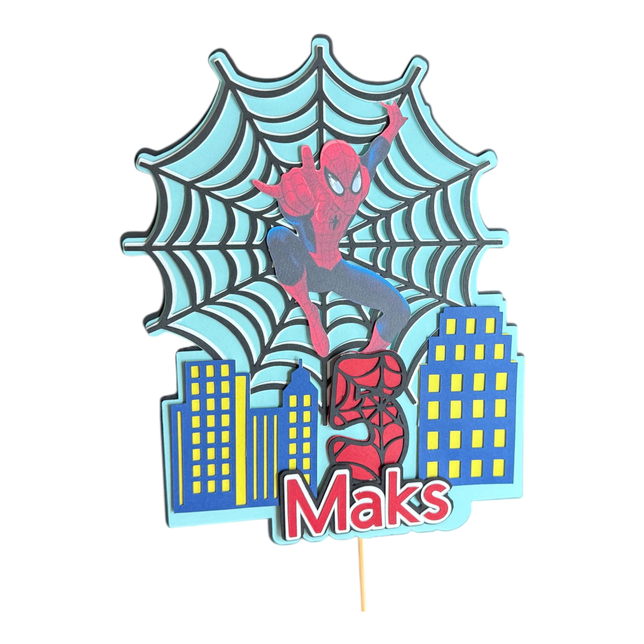 Topper wykonany jest z wysokiej jakości, trwałego kartonu o intensywnych kolorach. Na tle miasta i pajęczyny znajduje się postać superbohatera w dynamicznej pozie, a u dołu dodajemy imię dziecka oraz liczbę urodzin – dzięki czemu topper staje się unikalną pamiątką z przyjęcia.